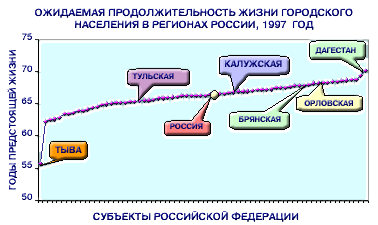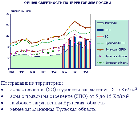 Демографическая ситуация в затронутых аварией районах в целом повторяет драматические тенденции, характерные для современной России, рост смертности и снижение рождаемости и, как следствие этого, естественная убыль населения. В отдельные годы (19921993 гг.), благодаря реализации мер социальной защиты, в зонах радиоактивного загрязнения удавалось добиваться некоторого улучшения показателей по рождаемости и снижения темпов роста смертности. Динамика интенсивных (нестандартизованных, грубых) показателей смертности после 1982 г. в наиболее загрязненных областях представлена на рисунке. Важно отметить, что поведение кривых смертности на пострадавших территориях в течение всего периода 19821997 г. в целом следует общероссийским тенденциям. При этом как до 1986 г., так и после смертность на территориях Брянской, Калужской, Орловской и Тульской областей была выше среднероссийской. Самые высокие значения грубого показателя наблюдались в Тульской области, где самое «старое население»: доля пенсионеров в населении Тульской области 27,3%, в Брянской 24,6%, а в целом по России 20,7% (данные 1997 года). Показатели смертности в зоне отселения (которая находится в Брянской области) и в зоне с правом на отселение (население которой до 1998 г. на 47% состояло из жителей Брянской области и на 42% из жителей Тульской области) несколько выше областных уровней, но заведомо ниже показателей сельской смертности в этих областях.