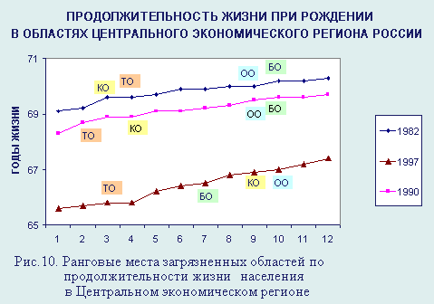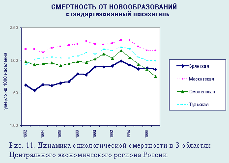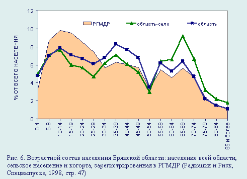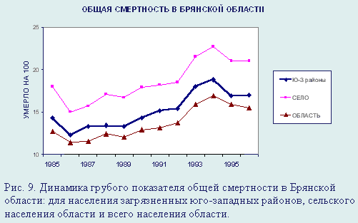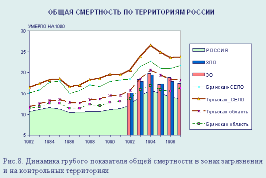 В 4-х наиболее загрязненных областях и непосредственно в зонах загрязнения развитие медико-демографической ситуации в основном определяется этими общими тенденциями. По показателям общей смертности Брянская, Калужская, Орловская и Тульская области не выходят за пределы значений, характерных для других областей ЦЭР. На уровне областной статистики не обнаружено корреляций между темпами изменения общей смертности онкосмертности со степенью загрязнения территории. По уровню общей смертности, показателям в ЗО и ЗПО не зафиксировано статистически значимых отклонений от среднеобластных значений. Процессы смертности в когорте ликвидаторов также не обнаруживают чернобыльской специфики.