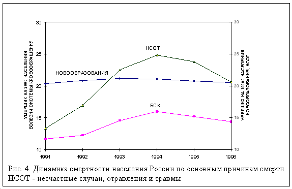 По сравнению с экономически развитыми странами для России характерны высокие фоновые риски смерти. Это обусловлено как длительной предысторией развития страны, так и социально-экономическими проблемами сегодняшнего дня. Отличительная черта современной ситуации высокая смертность от экзогенных причин, в особенности от НСОТ в трудоспособном возрасте.
